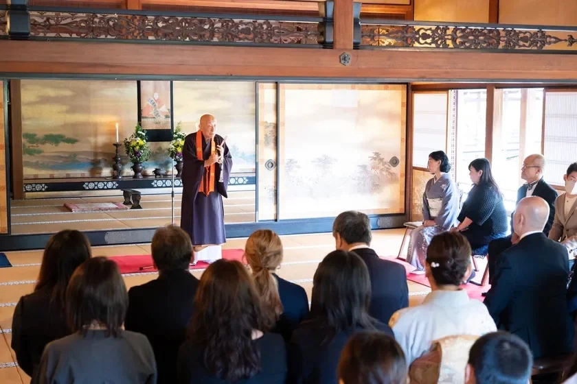 A group photo of various participants, including monks and people in kimonos, in a Japanese room.