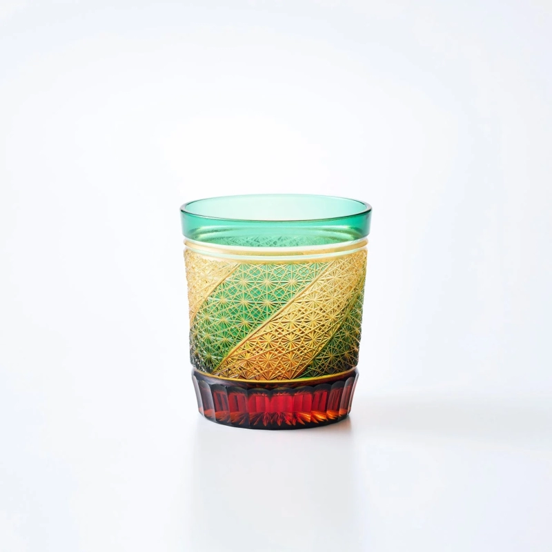 A beautiful Edo Kiriko cut glass with green, gold, and red hues, featuring intricate geometric patterns.