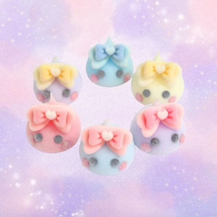 This fresh lineup introduces “Fluffy Ribbon Deca Hoppe-chan” and “Fluffy Rabbit Deca Hoppe-chan,” each priced at 825 yen (tax included). Measuring approximately 2.5cm across, these “Deca” (large) sized figures are crafted from silicone and plastic with the signature flocking. As each Hoppe-chan is handmade, slight variations in color and size add to their individual charm.