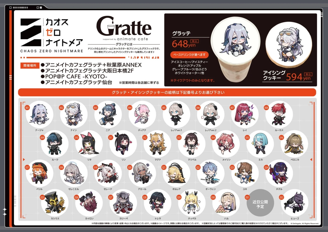 From April 22, 2026 (Wednesday) to May 22, 2026 (Friday), the collaboration cafe will open its doors in four major Japanese cities: Tokyo, Osaka, Kyoto, and Sendai. Anime and game enthusiasts in these regions can visit select Animate Cafe Gratté locations to immerse themselves in the CZN universe. A “Gratté” is a unique graphic latte where character visuals are artfully printed onto the cream, offering a visually stunning and delicious treat. Alongside these beverages, fans can also enjoy specially designed icing cookies, each featuring the distinct artwork of CZN’s captivating characters.